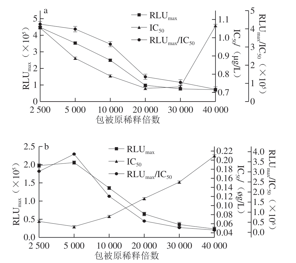 包被:用包被液将包被原稀释至相应的最适浓度,包被96 孔不透明白色发光板,每孔150 μL,4 ℃条件下16 h包被。封闭:经每孔300 μL洗液洗涤2 次后,每孔加入170 μL封闭液,37 ℃封闭4 h,甩干孔中的液体,置于37 ℃烘箱中2 h备用。竞争反应:加入标准品或样品溶液(50 μL/孔),先加入50 μL酶标二抗,再加入50 μL抗体工作液,混匀后25 ℃反应一定时间,洗涤4 次,每孔加入100 μL底物缓冲液和底物液等体积混合后的化学发光反应液,轻拍混匀,盖上盖板膜,2 min后用化学发光免疫分析仪测定每孔的发光值RLU。