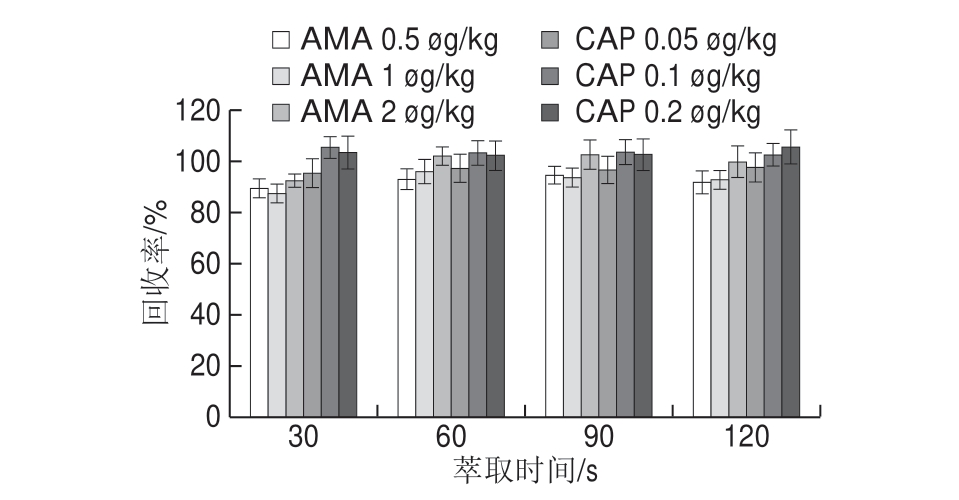 本研究的前处理方法中,加入纯水和乙酸乙酯后,比较不同振荡时间的提取效率,结果如图8所示。振荡时间越长,AMA和CAP的回收率越高,当振荡时间为4 min时,2 种药物的回收率与振荡时间3 min无显著差异。因此振荡时间确定为3 min。加入碳酸钾溶液后,比较不同萃取时间的提取效率,结果如图9所示,60 s已经将样品中的CAP和AMA几乎完全提取出,从节约时间和效率方面考虑,最终确定萃取时间为60 s。