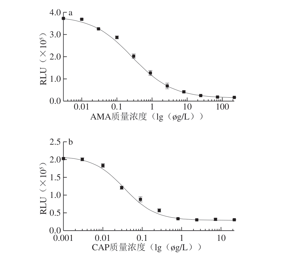 按照上述CLEIA条件优化结果,以AMA或CAP标准品溶液质量浓度对数为横坐标,RLU值为纵坐标,绘制标准曲线,结果如图5所示。AMA标准曲线的线性范围(IC20~IC80)为0.06~1.77 μg/L,IC50为0.33 μg/L,检出限为0.0 6 μ g/L。C A P 标准曲线的线性范围(IC20~IC80)为0.010~0.179 μg/L,IC50为0.039 μg/L,检出限为0.009 μg/L。