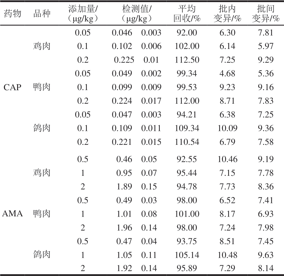 药物 品种 添加量/(μg/kg)检测值/(μg/kg)平均回收/%批内变异/%批间变异/%鸡肉0.05 0.046f 0.003 92.00 6.30 7.81 0.1 0.102f 0.006 102.00 6.14 5.97 0.2 0.225f 0.01 112.50 7.25 9.29 CAP 鸭肉0.05 0.049f 0.002 99.34 4.68 5.36 0.1 0.099f 0.009 99.53 9.23 9.16 0.2 0.224f 0.017 112.00 8.71 7.83鸽肉0.05 0.047f 0.003 94.21 6.38 7.25 0.1 0.109f 0.011 109.34 10.09 9.36 0.2 0.221f 0.015 110.54 6.79 7.58鸡肉0.5 0.46f 0.05 92.55 10.46 9.19 1 0.95f 0.07 95.44 7.15 7.78 2 1.89f 0.15 94.78 7.73 8.36 AMA 鸭肉0.5 0.49f 0.03 98.00 6.52 7.41 1 1.01f 0.08 101.00 8.17 6.93 2 1.96f 0.14 98.00 7.24 7.98鸽肉0.5 0.47f 0.04 93.75 8.51 7.45 1 1.05f 0.11 105.14 10.48 9.63 2 1.92f 0.14 95.89 7.29 8.14