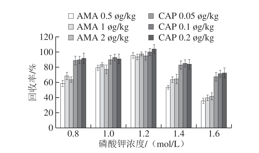 研究去离子水、氨水、碳酸钠溶液、氢氧化钠溶液和碳酸钾溶液5 种提取助剂的提取效果,结果如图6所示,根据回收率进行比较,提取AMA效果最好的是碳酸钾溶液,其次是氨水和碳酸钠溶液,去离子水和氢氧化钠溶液的提取效果较差。5 种提取助剂提取CAP差异性并不显著,都能取得良好的回收率。最终选择碳酸钾溶液为AMA和CAP的提取助剂。比较了不同浓度的碳酸钾的提取效率,由图7可知,当碳酸钾浓度为1.2 mol/L时,AMA和CAP的添加回收率达到最高,因此确定碳酸钾的最佳浓度为1.2 mol/L。