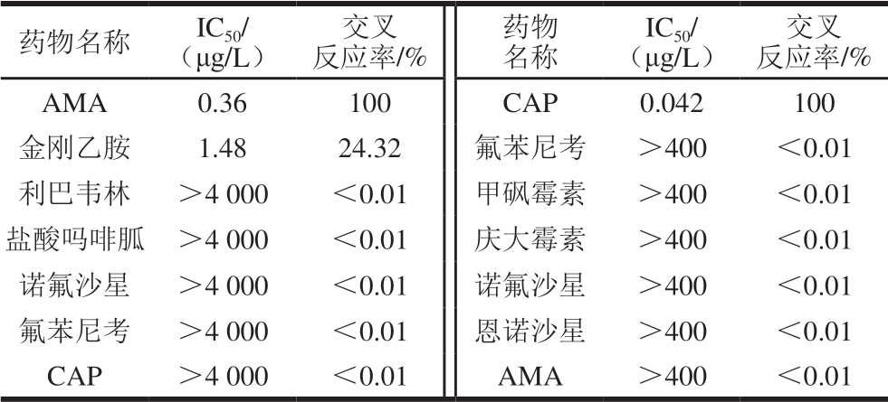 药物名称 IC50/(μg/L)交叉反应率/%药物名称IC50/(μg/L)交叉反应率/%AMA 0.36 100 CAP 0.042 100金刚乙胺 1.48 24.32 氟苯尼考 >400 <0.01利巴韦林 >4 000 <0.01 甲砜霉素 >400 <0.01盐酸吗啡胍 >4 000 <0.01 庆大霉素 >400 <0.01诺氟沙星 >4 000 <0.01 诺氟沙星 >400 <0.01氟苯尼考 >4 000 <0.01 恩诺沙星 >400 <0.01 CAP >4 000 <0.01 AMA >400 <0.01