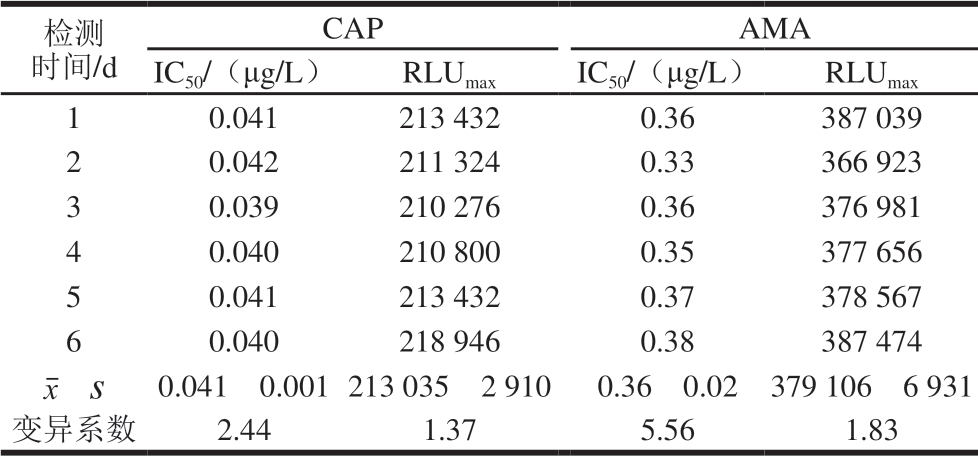 检测时间/d CAP AMA IC50/(μg/L) RLUmax IC50/(μg/L) RLUmax 1 0.041 213 432 0.36 387 039 2 0.042 211 324 0.33 366 923 3 0.039 210 276 0.36 376 981 4 0.040 210 800 0.35 377 656 5 0.041 213 432 0.37 378 567 6 0.040 218 946 0.38 387 474 f s 0.041f 0.001 213 035f 2 910 0.36f 0.02 379 106f 6 931变异系数 2.44 1.37 5.56 1.83