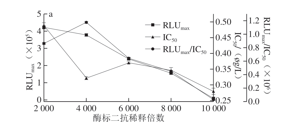 取96 孔化学发光板,用包被液将包被原作一系列稀释,稀释倍数为2 500、5 000、10 000、20 000、30 000、40 000 倍;AMA多克隆抗体按5 000、10 000、15 000、20 000、40 000 倍稀释,而CAP单克隆抗体按20 000、40 000、80 000、120 000、160 000 倍稀释,按照1.3.1节的步骤操作,计算出标准曲线的RLUmax、IC50和RLUmax/IC50,以RLUmax/IC50较高、IC50较低、RLUmax适中时的条件为CLEIA的最佳反应条件。