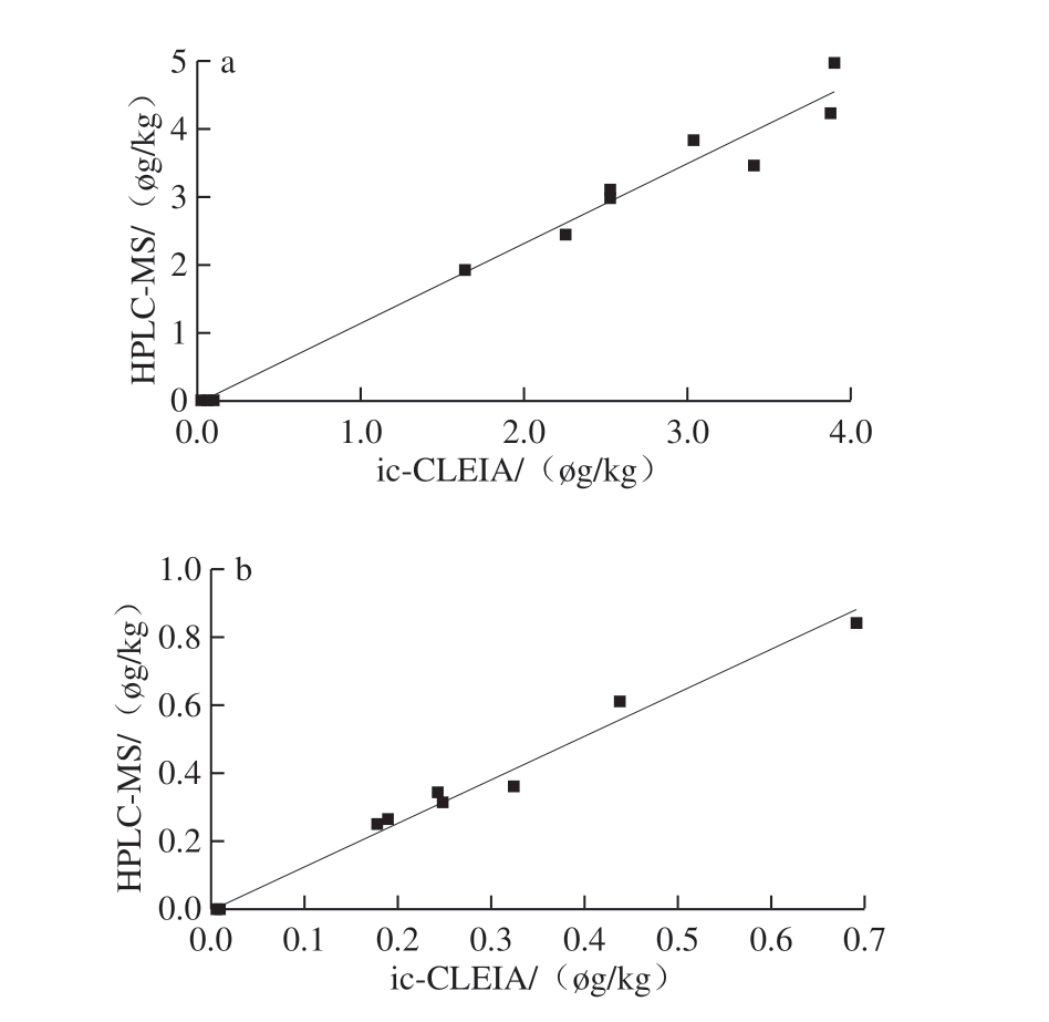 图11 AMA(a)和CAP(b)ic-CLEIA与LC-MS方法对比