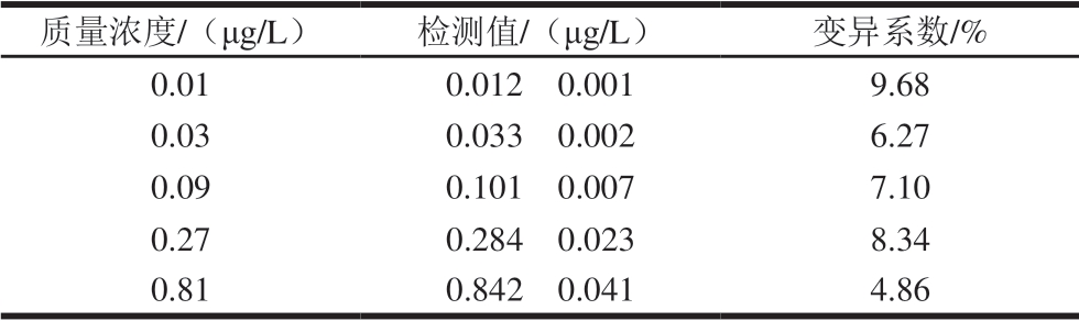 质量浓度/(μg/L) 检测值/(μg/L) 变异系数/%0.01 0.012f 0.001 9.68 0.03 0.033f 0.002 6.27 0.09 0.101f 0.007 7.10 0.27 0.284f 0.023 8.34 0.81 0.842f 0.041 4.86