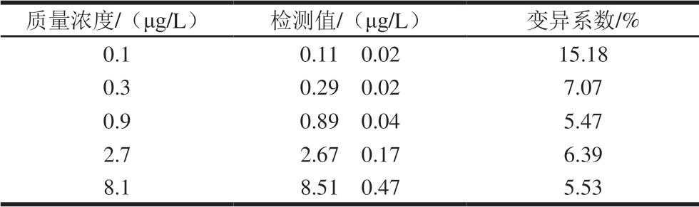 质量浓度/(μg/L) 检测值/(μg/L) 变异系数/%0.1 0.11f 0.02 15.18 0.3 0.29f 0.02 7.07 0.9 0.89f 0.04 5.47 2.7 2.67f 0.17 6.39 8.1 8.51f 0.47 5.53
