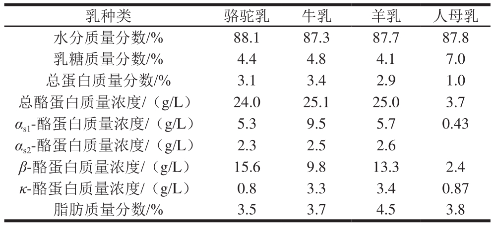除了对比骆驼乳和牛乳的不同,也有研究对比了骆驼乳、牛乳、羊乳和人母乳在主要营养组成上的差异。如表3所示,与人母乳相比,骆驼乳含有相对更低的乳糖和更高比例的蛋白质。在酪蛋白的种类上牛乳以α-酪蛋白为主,骆驼乳和羊乳则以β-酪蛋白含量最多,人母乳不含αs2-酪蛋白,羊乳和骆驼乳含较少的αs2-酪蛋白和大量的β-酪蛋白,因此在酪蛋白组成方面骆驼乳比牛乳更接近人母乳[18]。