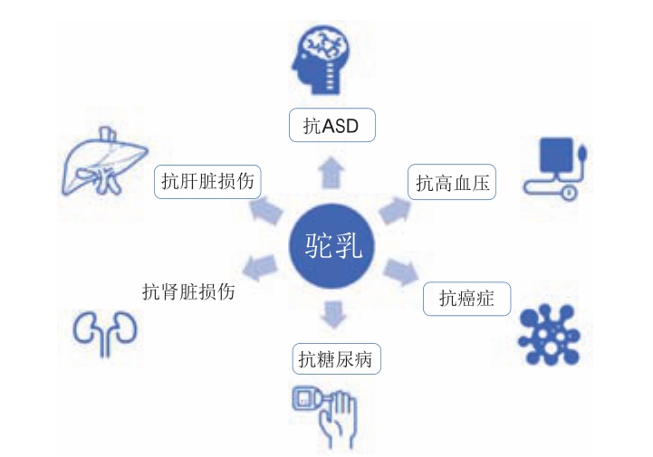 大量研究表明,骆驼乳具有一定的调节机体功能的药用特性,对多种类型的涉及不同系统的疾病有潜在的益处。骆驼乳的营养组成特征赋予了其多样化的药用价值和在机体中发挥生物作用的能力,这些作用包括抗氧化、抗炎、免疫调节、肠道菌群微生态调节等方面,是骆驼乳在多种疾病体系中表现出有益功效的共有作用基础。