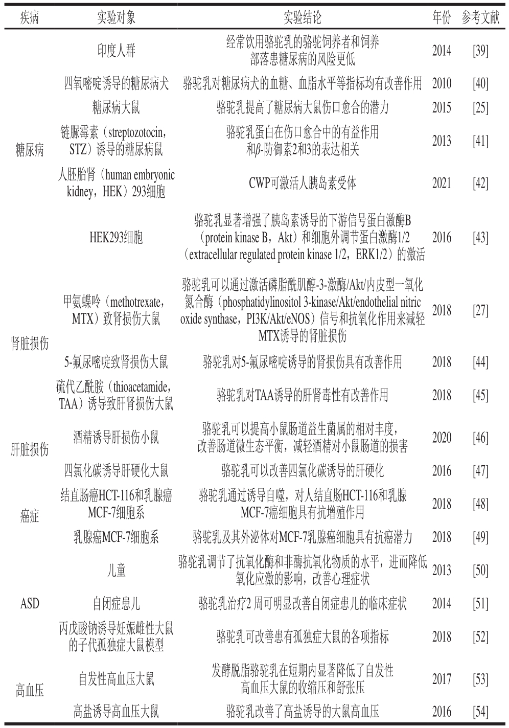 骆驼乳传统上被认为具有药用特性,近年来的研究显示骆驼乳可缓解多种疾病(包括糖尿病、高血压、癌症、自闭症谱系障碍(autistic spectrum disorder,ASD)、肾脏及肝脏损伤等)(图1)。下文将分别汇总骆驼乳预防或帮助缓解这些疾病的研究进展(表4)。