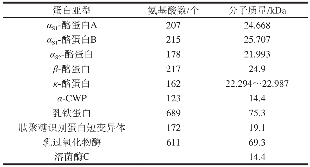 蛋白亚型 氨基酸数/个 分子质量/kDa αS1-酪蛋白A 207 24.668 αS1-酪蛋白B 215 25.707 αS2-酪蛋白 178 21.993 β-酪蛋白 217 24.9 κ-酪蛋白 162 22.294~22.987 α-CWP 123 14.4乳铁蛋白 689 75.3肽聚糖识别蛋白短变异体 172 19.1乳过氧化物酶 611 69.3溶菌酶C 14.4