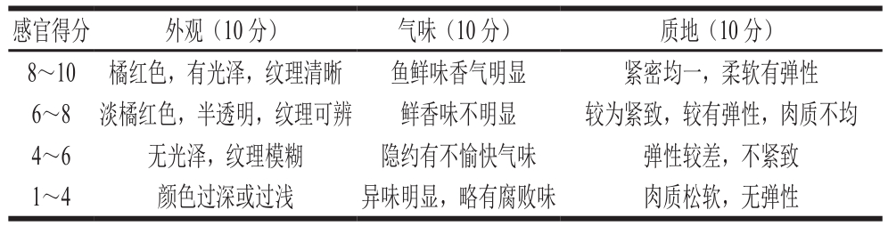 感官得分 外观(10 分) 气味(10 分) 质地(10 分)8~10 橘红色,有光泽,纹理清晰 鱼鲜味香气明显 紧密均一,柔软有弹性6~8 淡橘红色,半透明,纹理可辨 鲜香味不明显 较为紧致,较有弹性,肉质不均4~6 无光泽,纹理模糊 隐约有不愉快气味 弹性较差,不紧致1~4 颜色过深或过浅 异味明显,略有腐败味 肉质松软,无弹性