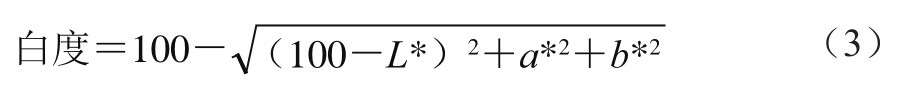 生食鱼片按照不同解冻方式解冻完成后用滤纸将表面水分吸干,将其切分为1.5 cm×1.5 cm大小,置于遮光杯中用色差仪分别测定其L*值、a*值、b*值,白度按式(3)计算。