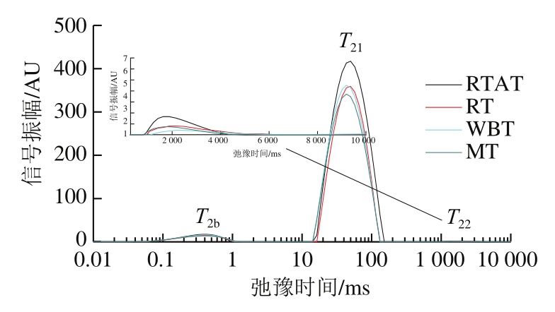 图6 生食鱼片在RTAT、RT、WBT和MT下的LF-NMR图谱