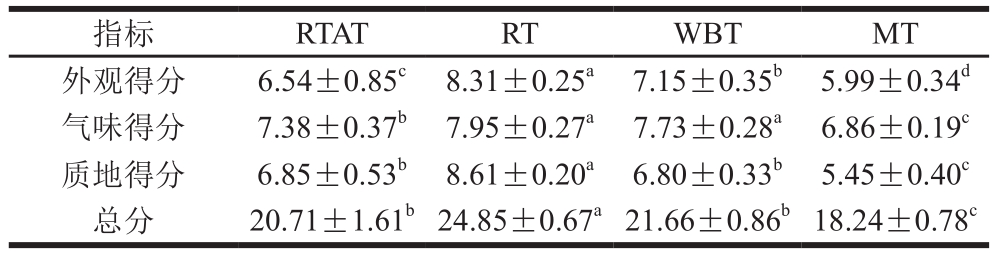 指标 RTAT RT WBT MT外观得分 6.54±0.85c 8.31±0.25a 7.15±0.35b 5.99±0.34d气味得分 7.38±0.37b 7.95±0.27a 7.73±0.28a 6.86±0.19c质地得分 6.85±0.53b 8.61±0.20a 6.80±0.33b 5.45±0.40c总分 20.71±1.61b24.85±0.67a21.66±0.86b18.24±0.78c