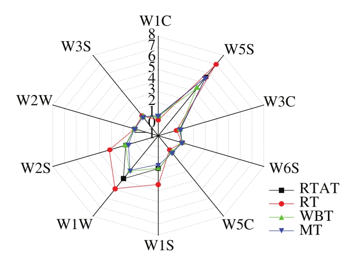 图9 生食鱼片在RTAT、RT、WBT和MT下的电子鼻传感器响应雷达图