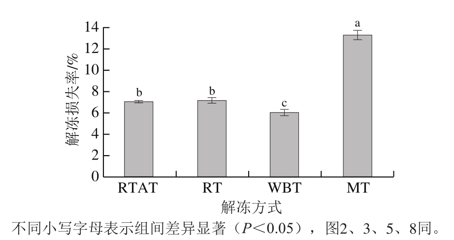 如表4所示,生食鱼片不同解冻方式的解冻速率差异明显,采用RT的生食鱼片解冻速率最慢,而采用MT的解冻速率最快,为86.667 ℃/min,这是由于微波在交变电场的作用下,使冻结肉中的极性基团剧烈振荡、摩擦,由此将微波能转化为热能,能在低温下具有较强的穿透能力[15]。与RTAT相比,WBT具有较快的解冻速率,这是因为水的比热容比空气大,传热速率比空气快,因此能够明显缩短解冻时间[16]。Backi的研究表明解冻速率与解冻损失率之间呈非线性关系,且解冻速率和解冻损失率与解冻介质、温度及方式等因素有关[17]。图1表征了不同解冻方式下生食鱼片的解冻损失率,WBT生食鱼片解冻损失率为6.05%,RTAT和RT生食鱼片解冻损失率差异不显著(P>0.05),而MT生食鱼片的解冻损失率最大,为13.31%。造成这种结果的原因主要是微波会使极性水分子振动,而极性水分子在鱼肉内分布不均匀,这使鱼片不同部位对热能的吸收程度出现差异,导致MT解冻不均匀,甚至使得部分蛋白质结构被严重破坏,融化后的水分子不能与之结合,从而表现出较大的解冻损失率[18]。Hurling等研究发现,用空气解冻和水浴解冻鳕鱼,其肌原纤维蛋白质功能性损伤程度不同,进一步导致了水分的重新吸收速率不同[19]。因此,综合解冻速率和解冻损失率来看,采用WBT有助于降低生食鱼片在解冻过程中水分的流失。