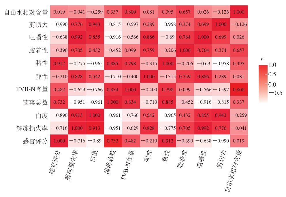 Fig. 11 Correlation coefficients among quality parameters of thawed fillets