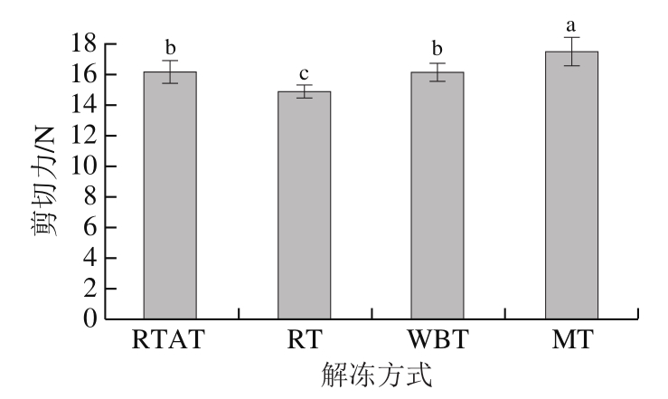 咀嚼性和胶着性主要反映细胞间结合能力的强弱程度,经过RT的生食鱼片咀嚼性和胶着性较好可能是因为其内部肌纤维结构整齐致密,组织间隙最小,使其具有较强的结合能力。嫩度是评价肉类食用品质的又一重要指标,与含水量和肌纤维结构密切相关,由于嫩度与剪切力成反比,因此可以用剪切力表征生食鱼片的嫩度[29-30]。从图5可以看出,生食鱼片经过不同解冻方式解冻后的剪切力具有显著性差异(P<0.05),但RTAT和WBT对生食鱼片的剪切力影响差异不显著(P>0.05)。其中RT由于对生食鱼片的肌纤维组织结构破坏作用小于其他解冻方法,因此经RT后的生食鱼片剪切力最小,为14.81 N,从而表现出较高的嫩度。而在MT的过程中,生食鱼片的水分流失最多,肌纤维的收缩增加了纤维的密度,从而增加了切断纤维所需的力,其剪切力为17.47 N,在4 种解冻方式中最大,嫩度最低[31]。以上说明经过RT的生食鱼片较其他解冻方式具有更优良的质构特性。