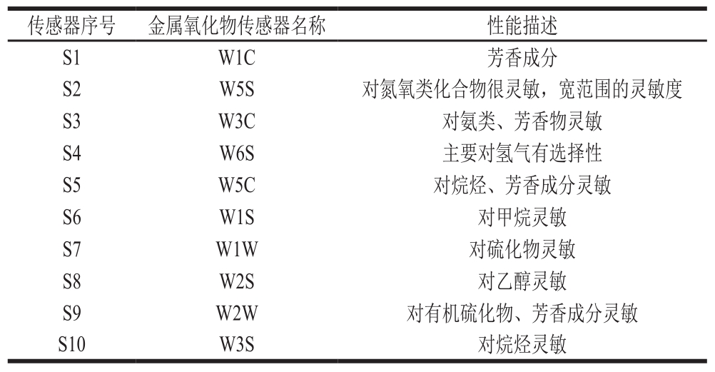 传感器序号 金属氧化物传感器名称 性能描述S1 W1C 芳香成分S2 W5S 对氮氧类化合物很灵敏,宽范围的灵敏度S3 W3C 对氨类、芳香物灵敏S4 W6S 主要对氢气有选择性S5 W5C 对烷烃、芳香成分灵敏S6 W1S 对甲烷灵敏S7 W1W 对硫化物灵敏S8 W2S 对乙醇灵敏S9 W2W 对有机硫化物、芳香成分灵敏S10 W3S 对烷烃灵敏