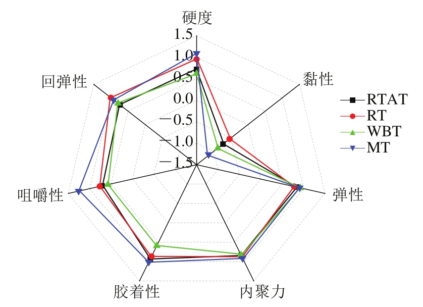 图4 生食鱼片在RTAT、RT、WBT和MT下的全质构模式检测指标结果