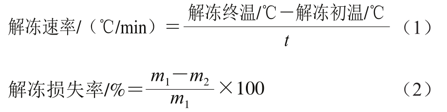 将生食鱼片从超低温冰箱取出后立即对其称质量,此时记录解冻前质量(m1/g),按照不同解冻方式解冻完成之后,记录解冻时间(t/min),用滤纸将鱼片表面的水分吸去,再次称质量(m2/g),则解冻速率按式(1)计算,解冻损失率按式(2)计算。
