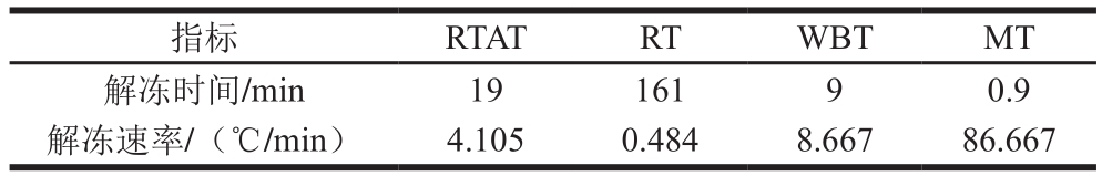 指标 RTAT RT WBT MT解冻时间/min 19 161 9 0.9解冻速率/(℃/min) 4.105 0.484 8.667 86.667