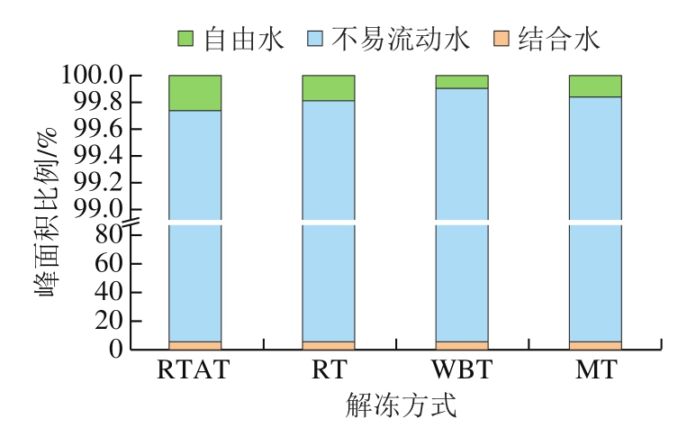 图7 生食鱼片在RTAT、RT、WBT和MT下不同状态水的峰面积比例