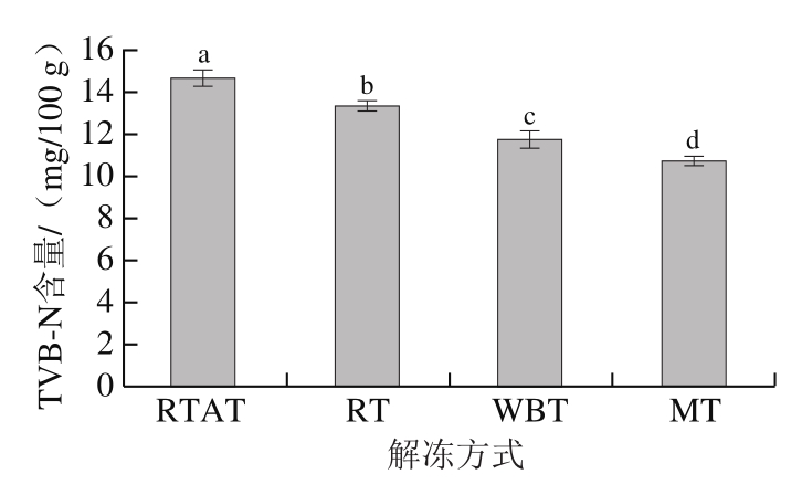 挥发性盐基氮是指肉品中由于酶和微生物的作用,蛋白质分解产生氨以及胺类等碱性含氮物质,其含量是衡量肉品新鲜度的常见指标[23]。从图3可以看出,不同解冻方式对生食鱼片的TVB-N含量影响显著(P<0.05),其含量从大到小依次为RTAT组>RT组>WBT组>MT组,但不论经过何种方式解冻,生食鱼片的TVB-N含量都低于15.00 mg/100 g,新鲜度较高。其中,经MT后的生食鱼片TVB-N含量最低(10.74 mg/100 g),可能是因为其解冻时间最短,微生物和内源性酶如(钙蛋白酶、组胺脱羧酶)对其蛋白质的分解少,产生的氨以及胺类等碱性含氮物质少[24-25]。而WBT生鱼片的TVB-N含量为11.76 mg/100 g,仅高于MT生鱼片(高1.02 mg/100 g),RTAT与RT相比虽具有较快的解冻速率,但前者所处的解冻环境温度较高,更有利于酶的作用和微生物的活动,对生食鱼片的蛋白质分解程度较高,产生了更多的氨以及胺类等碱性含氮物质,因此表现为更高的TVB-N含量。由此可知,采用MT和WBT能够较好地延缓生食鱼片中氨及胺类等碱性含氮物质的产生,更好地维持其新鲜度。