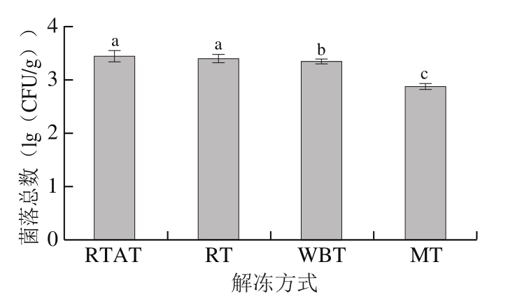 微生物在一定程度上会使生食鱼片在解冻过程中的品质受到影响。从图8可以看出,不同解冻方式显著影响生食鱼片菌落总数(P<0.05),从大到小依次:RTAT组(3.45(lg(CFU/g)))>RT组(3.40(lg(CFU/g)))>WBT组(3.34(lg(CFU/g)))>MT组(2.88(lg(CFU/g))),均未超过6.00(lg(CFU/g))的限值[35]。由此可得,MT能较好地抑制生食鱼片中微生物的生长繁殖,而RTA和RT下的生食鱼片菌落总数相当,这可能是因为MT的解冻环境温度较高,RTAT、RT生食鱼片与空气接触的时间较长且具有较高湿度,二者都为微生物的生长繁殖提供了有利条件[36]。