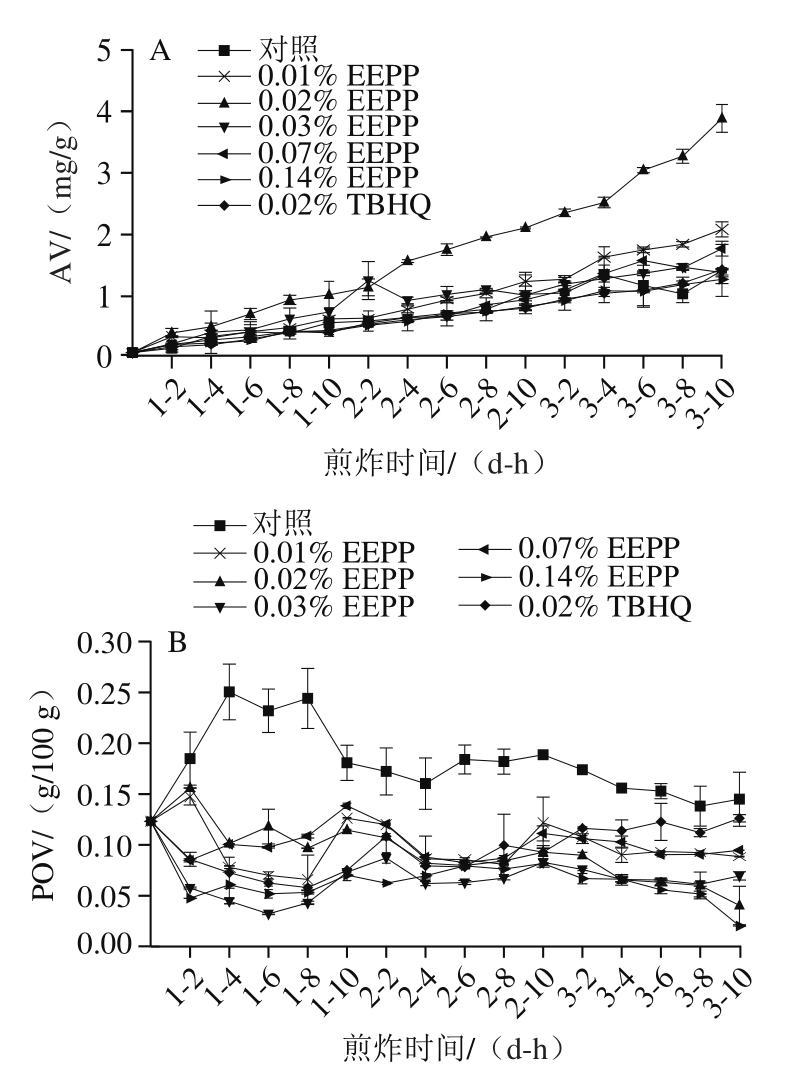 AV能反映油炸过程中水解反应产生的游离脂肪酸含量。在深度油炸过程中,伴随着三酰甘油的水解和不饱和脂肪酸的氧化分解,游离脂肪酸产生,其含量逐渐增大,导致煎炸油中AV数值的持续增加[36]。如图3A所示,随着煎炸时间的延长,AV总体呈逐渐上升的趋势,但所有处理组煎炸3 d后,其AV均不超过食用植物油的法定最大允许值(5 mg/g)[37],因此未能判断EEPP对延长煎炸油使用时间的情况。另外,煎炸期间添加0.02% EEPP煎炸油AV含量(0.088~3.882 mg/g)高于其他处理组(0.088~2.085 mg/g);与其他浓度的EEPP实验组相比,添加0.14% EEPP的煎炸油具有最低的AV水平,且与TBHQ实验组相当,其增长趋势比未添加抗氧化剂的缓慢。这表明0.14% EEPP对游离脂肪酸分解具有一定的抑制效果,具有明显的抑制油脂水解和不饱和脂肪深度氧化酸败的作用,其抑制作用可能与TBHQ相当甚至更好。