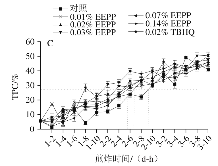 EEPP按0.01%、0.02%、0.03%、0.07%和0.14%的添加量(相对于煎炸油的体积)溶于乙醇(1∶8)并加入到大豆油中,待均匀溶解后,按上述油炸步骤进行油炸实验,以不添加EEPP作为阴性对照,添加0.02%特丁基对苯二酚(tert-butyl hydroquinone,TBHQ)作为阳性对照。