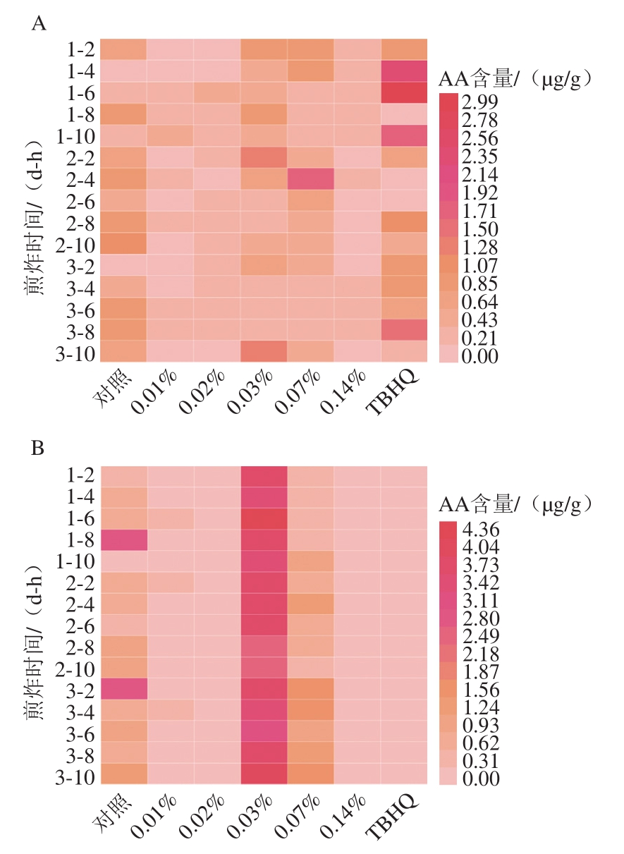 图5 不同添加量EEPP的薯条(A)和煎炸油(B)中AA的热图分析