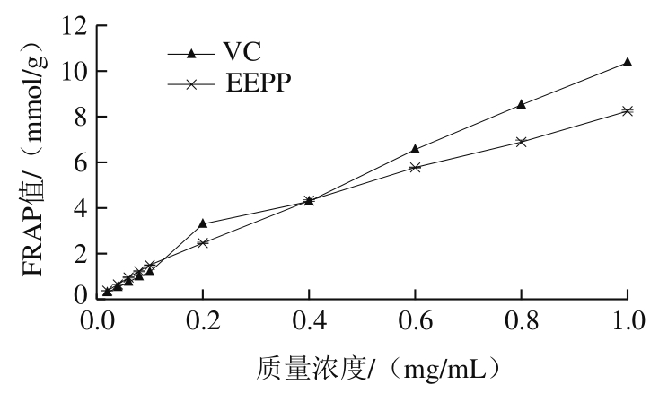 参考Song Fenglin等[26]的方法并稍作修改。FRAP溶液制备:将300 mmol/L醋酸盐缓冲液(pH 3.6)、10 mmol/L 2,4,6-三吡啶基-S-三嗪溶液和20 mmol/L FeCl3溶液以10∶1∶1的比例混匀,37 ℃预热。称取0.055 6 g七水合硫酸亚铁用蒸馏水定容至50 mL,分别移取0.25、0.5、1、2、4、5 mL定容至10 mL,制得浓度分别为0.1、0.2、0.4、0.8、1.6、2 mmol/L的FeSO4溶液。将0.1 mL不同浓度的FeSO4与3 mL FRAP溶液混合1 min,并在37 ℃反应4 min,波长593 nm处测定吸光度,每个样品平行测定3 次,以浓度为X轴,吸光度为Y轴绘制标准曲线。将不同浓度的EEPP和VC溶液按上述步骤测定吸光度。以每克干质量还原Fe2+物质的量表示(mmol/g)。