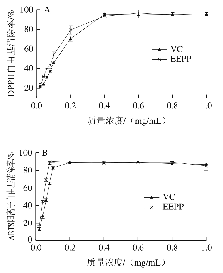 图1 EEPP对DPPH自由基(A)和ABTS阳离子自由基(B)的清除率