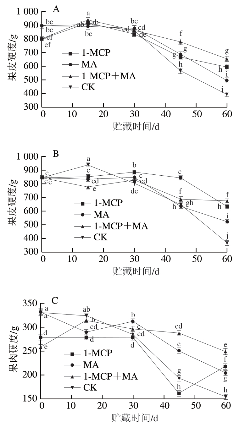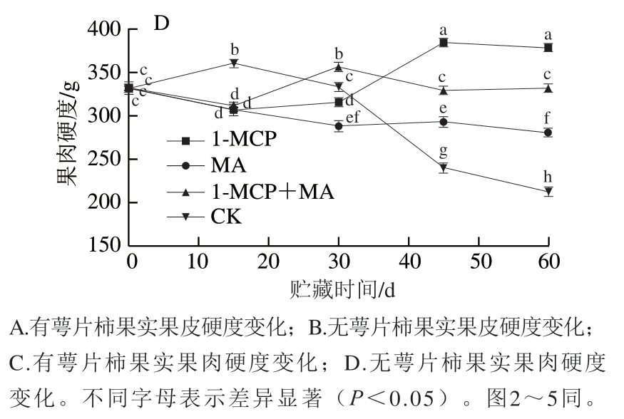 1-甲基环丙烯(1-methylcyclopropene,1-MCP)是一种乙烯受体抑制剂,可强烈竞争乙烯受体,与其发生不可逆结合,进而抑制乙烯释放,达到减缓果蔬后熟衰老进程、延长贮藏保鲜期的目的。气调贮藏(modified atmosphere packaging,MA)通过贮藏环境内外气体交换和产品自身呼吸作用,形成相对高CO2、低O2浓度的贮藏微环境,调控产品采后生理代谢,进而提高保鲜效果[4]。由于1-MCP具有高效、无毒、低残留的优点,且在延缓果蔬后熟衰老、维持品质和延长贮藏期方面呈现出显著效果,因此在采后果蔬贮藏保鲜上具有重要的应用价值。已有研究表明1-MCP处理对桃[5]、梨[6-7]、苹果[8-9]等呼吸跃变型水果具有显著的保鲜效果;相关研究表明不同浓度1-MCP处理均可保持柿果的感官品质、色泽及VC含量,降低乙烯生成速率和丙二醛含量,并有效抑制柿果实软化[10-12];1-MCP和其他处理联合使用的效果更为显著,如对比单一处理,1-MCP联合聚氯乙烯保鲜膜处理能更有效抑制柿果硬度的下降、褐变程度的加剧、丙二醛含量的升高[13];联合低温(1 ℃)处理[14-15]或气调包装[16-17]可明显减轻柿果冷害。