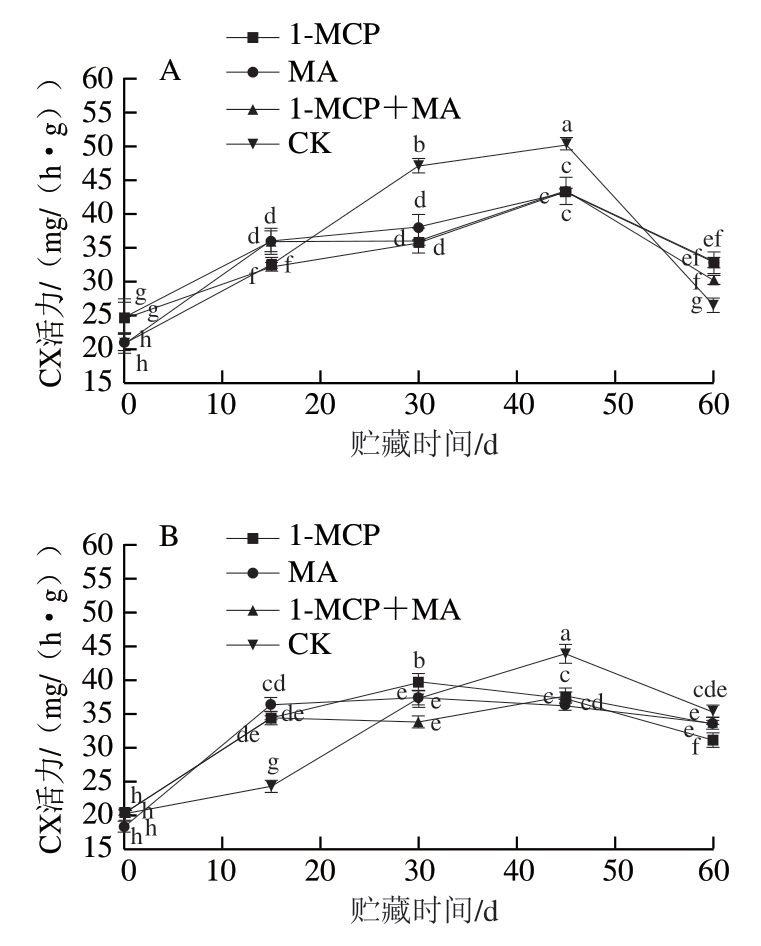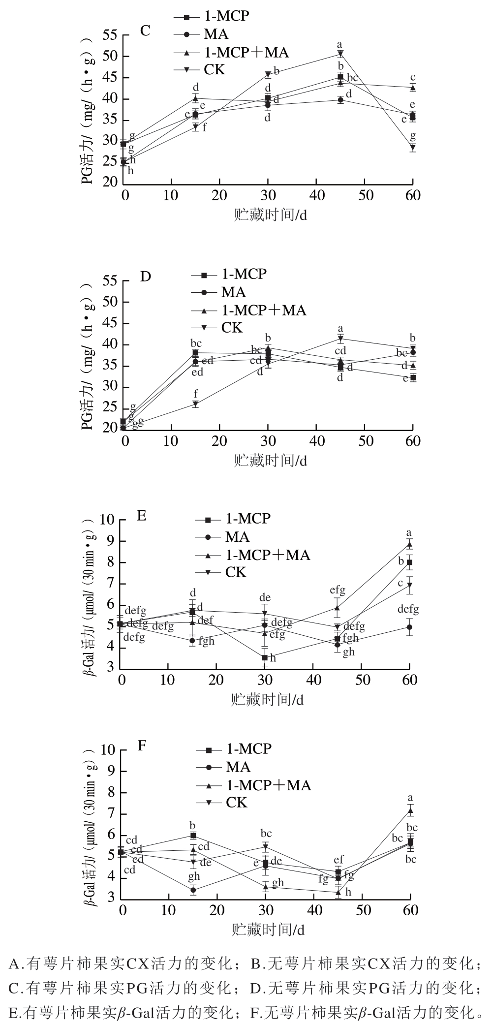 如图2A~D所示,火柿冰温贮藏至第45天时,有、无萼片火柿对照组CX、PG活力均高于其他处理组,无萼片各处理组CX、PG活力略低于有萼片组,说明当贮藏45 d时,1-MCP、MA及1-MCP+MA处理均对火柿CX、PG活力起到抑制作用,且结合去萼片处理效果更佳。从贮藏期的第45天至结束,有萼片对照组CX、PG活力急剧下降,贮藏期结束时对比其他处理组最低;而无萼片对照组CX、PG活力缓慢下降,至贮藏期结束时仍高于其他处理组,说明1-MCP、MA及1-MCP+MA在贮藏中后期均能抑制CX、PG活力,且结合去萼处理对CX、PG活力的抑制作用优于保留萼片处理,其中尤其以无萼片1-MCP处理组效果最佳。如图2E、F所示,在冰温贮藏过程中,至第60天时,1-MCP+MA处理组β-Gal活力显著大于其他各处理组(P<0.05),有萼片MA处理组β-Gal活力低于对照组,有萼片处理对比去萼片处理抑制效果显著,说明有萼片结合MA处理更能抑制β-Gal活力。