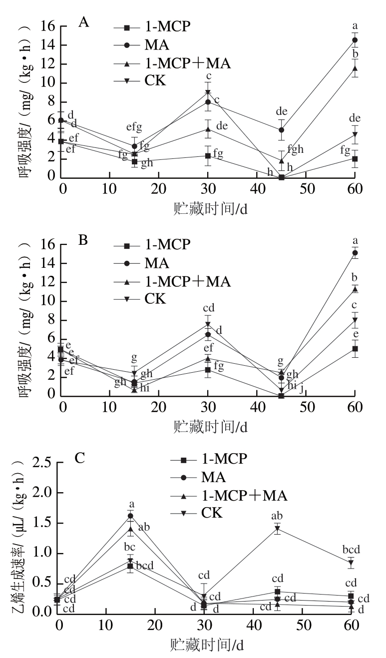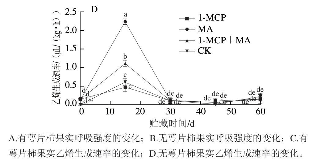 如图4A、B所示,经不同处理火柿的呼吸强度变化趋势基本一致,均为前15 d下降,之后上升,至第30天时达到呼吸峰值后再下降,第45天后再次上升。有、无萼片柿果在贮藏第30天时均出现首次呼吸高峰,具有典型的跃变型果实呼吸特征,其中有、无萼片对照组呼吸强度峰值均最高,且有萼片对照组呼吸强度峰值高于无萼片对照组;处理组在首次呼吸高峰时的呼吸强度峰值均维持在较低水平,说明1-MCP、MA、1-MCP+MA在冰温贮藏前期均可抑制火柿呼吸强度,且1-MCP和1-MCP+MA处理显著低于对照(P<0.05),抑制呼吸作用效果显著。至第60天时,有萼片和无萼片火柿呼吸强度均为MA>1-MCP+MA>对照>1-MCP,且有萼片组1-MCP处理组呼吸强度为最低,说明有萼片组1-MCP处理在贮藏后期抑制柿果呼吸强度效果最好。