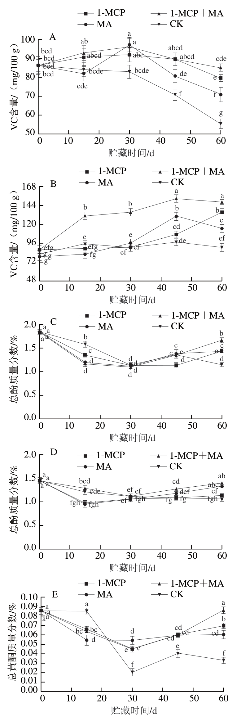 果实呼吸强度和乙烯生成与VC、总酚、总黄酮的合成和降解密切相关。采后生理代谢受多种因素影响,且在贮藏期间个体差异较大,因此本实验火柿中的VC、总酚、总黄酮水平变化有一定的波动性。但仍可看出1-MCP、MA、1-MCP+MA结合冰温处理均有助于减少火柿在贮藏期间VC、总酚、总黄酮的损失,尤其在贮藏后期,1-MCP+MA处理总体上效果最为显著(P<0.05),且去萼片处理效果整体上优于保留萼片。