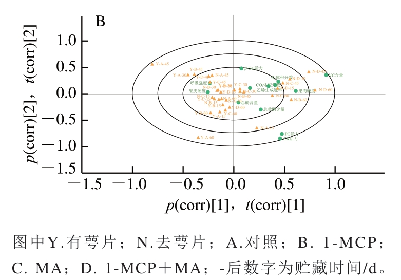 为综合分析各指标与处理条件之间的关系,引入PCA-X可视化与量化不同指标、处理条件之间的相关性。如图6A所示,共提取2 个主成分(principal component,PC)(特征值>1),其中R2X累计方差贡献为0.589,能反映火柿贮藏期间品质变化。为更加直观表现不同指标在不同PC下的表现以及与不同处理方式之间的相关性绘制Biplot双标图,以火柿在冰温贮藏期间不同处理方式下的不同品质指标变化为分析对象,对其进行相关性分析,不同处理方式样品的位置越接近,表示其具有更相近的贮藏品质;不同指标与处理方式的位置越接近,表示其相关性越高。如图6B所示,保留萼片处理与去萼片之间有较明显的区域分布差异,其中尤其以去萼片结合1-MCP+MA、MA处理样品的位置与有萼片各处理样品的位置距离最远,说明去萼片结合1-MCP+MA、MA处理对比对照所引起的贮藏品质变化效果明显。结合各指标在图中的位置可知,去萼片处理与柿果VC含量、果肉硬度、O2体积分数、CO2体积分数、乙烯生成速率、总黄酮质量分数及CX、PG活力的相关性更高,而保留萼片处理与柿果呼吸强度、果皮硬度、总酚质量分数、β-Gal活力的相关性更高。
