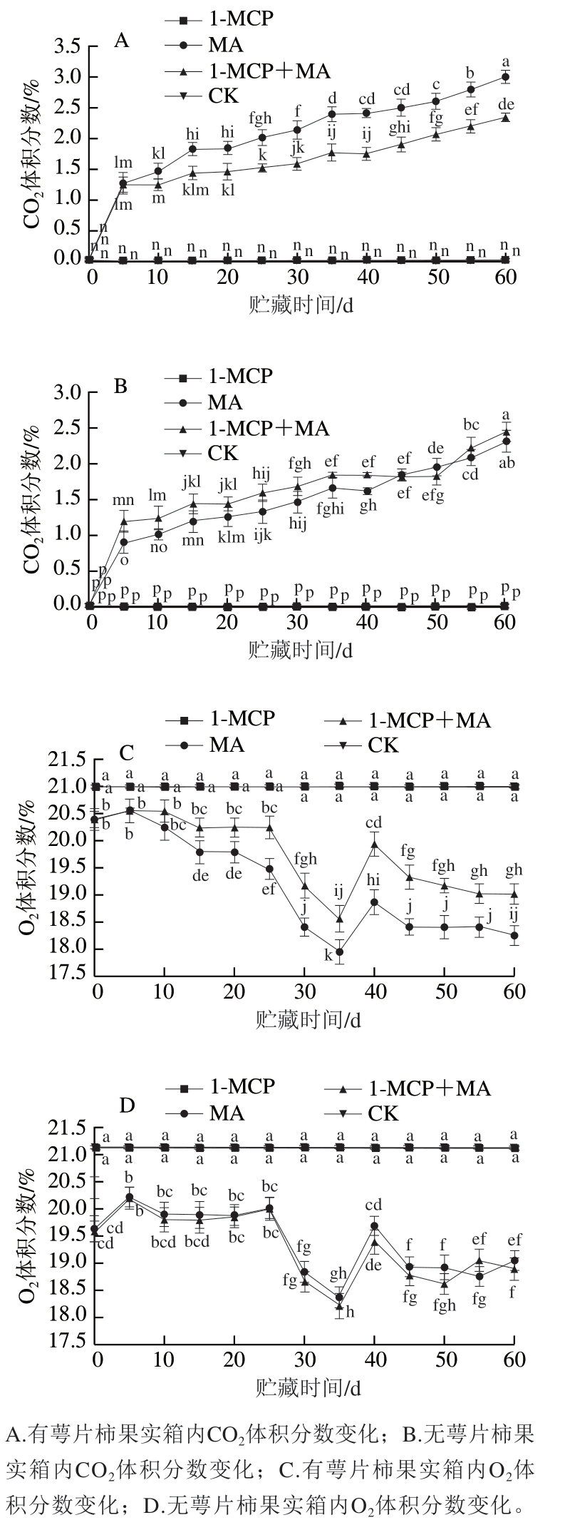 贮藏环境中的O2体积分数变化趋势与CO2体积分数相反,如图3C、D所示,随着贮藏时间的延长,有萼片火柿的O2体积分数下降速率MA>1-MCP+MA,至贮藏期结束,MA组O2体积分数显著低于其他处理组(P<0.05);去萼片结合MA、1-MCP+MA处理组箱内O2体积分数下降速率无明显差异;有、无萼片1-MCP和对照组均无明显变化。由此可知,有萼片时,MA处理对于贮藏环境中O2体积分数的降低最有效果。