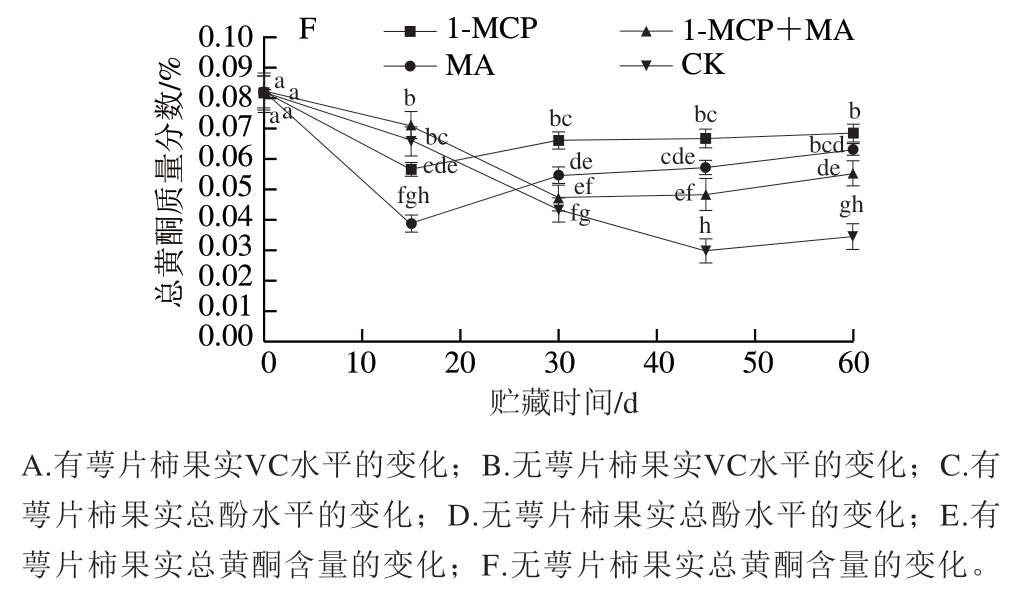 如图5A、B所示,在冰温贮藏过程中,至第60天时,有萼片和无萼片处理柿果VC含量均为1-MCP+MA>1-MCP>MA>对照,且1-MCP+MA、1-MCP处理组VC含量均显著高于对照;但对比初始VC含量,有萼片柿果各处理组略有降低,而无萼片柿果各处理组均有所增加。说明1-MCP、MA、1-MCP+MA处理均可减少火柿VC的损失,其中1-MCP+MA、1-MCP处理效果最佳,结合去萼片处理,能促进火柿VC含量增加,阻止自由基的积累,延缓柿果衰老。如图5C、D所示,在冰温贮藏至第60天时,各处理组总酚质量分数均有所降低,但处理组的总酚质量分数均高于对照组,其中去萼片的1-MCP+MA处理组下降幅度最小,显著高于对照组(P<0.05),说明该处理能在贮藏中后期有效阻止火柿总酚质量分数的降低,控制果肉褐变的发生,保持火柿营养品质。如图5E、F所示,在冰温贮藏过程中,至第60天时,柿果总黄酮质量分数均有所下降,但各处理组的总黄酮质量分数均显著高于对照(P<0.05),其中有萼片柿果1-MCP+MA>1-MCP>MA>对照,无萼片柿果1-MCP>MA>1-MCP+MA>对照,说明1-MCP、MA、1-MCP+MA处理均可减少火柿总黄酮质量分数的降低。综上,至冰温贮藏结束,有、无萼片对照组VC、总酚、总黄酮质量分数总为最低,说明1-MCP、MA、1-MCP+MA处理在贮藏中后期均能降低火柿中VC、总酚、总黄酮质量分数的损耗,尤其以1-MCP+MA效果最佳。