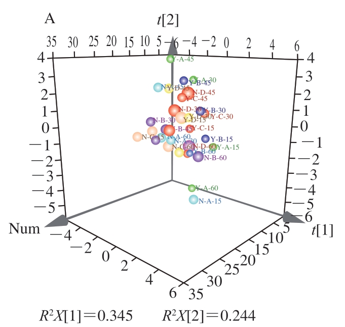 本实验中每个指标测定均重复3 次,结果以平均值±标准差表示。采用Excel 2010软件处理数据,采用SPSS 26.0软件进行单因素方差分析,通过单因素方差分析中的Kruskal-Wallis 法及邓肯多重比较检验组间差异显著性,P<0.05表示差异显著。采用Simca 14.1软件对火柿于冰温贮藏期间不同处理方式下的不同品质指标数据进行主成分分析(principal component analysis,PCA),采用Origin 2020软件作图。