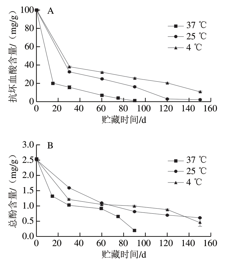 Fig. 2 Changes of ascorbic acid (A) and total phenol (B) contents in preserved strawberry during storage at different temperatures