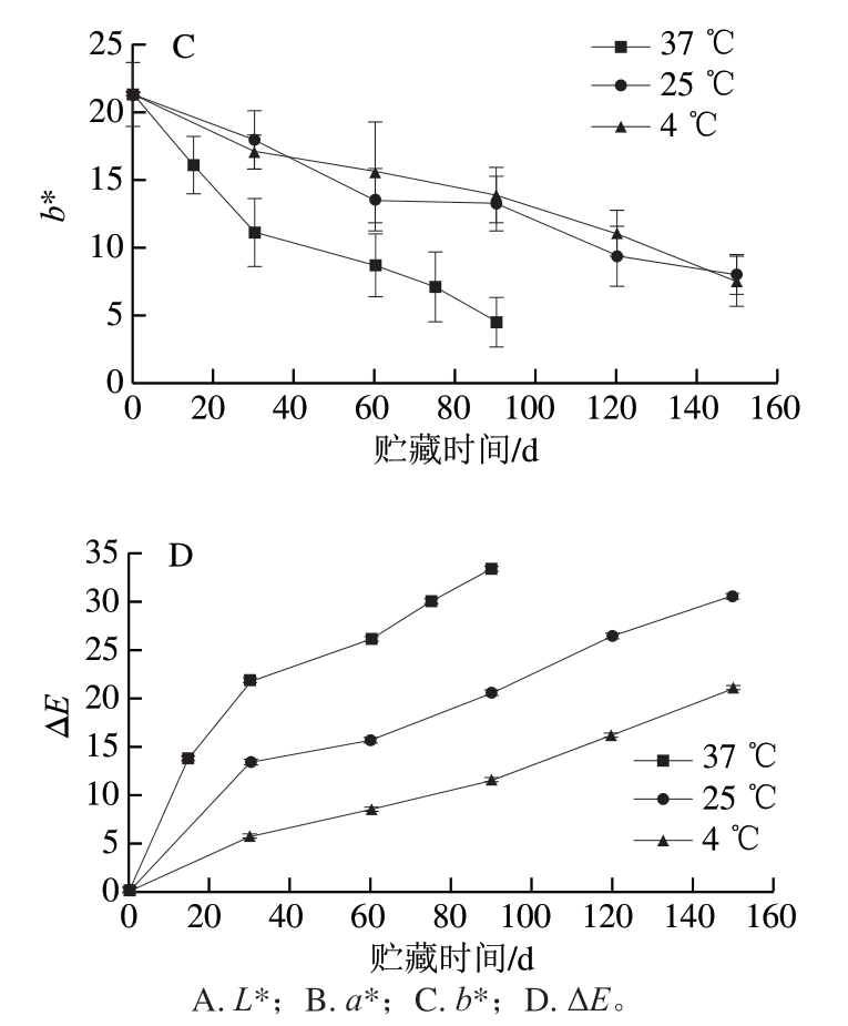另外,从色差值ΔE的变化来看,3 个温度下ΔE均随时间延长呈现上升趋势,ΔE增加说明色泽变化越来越明显。相比初始值,37 ℃下贮藏90 d时ΔE达33.33,25 ℃和4 ℃下贮藏90 d时ΔE分别为20.49与11.42,150 d时则达30.51和20.99,均大于报道中贮藏后蜂蜜ΔE(<7)[13]和苹果酱ΔE(<20)[14],这说明草莓脯色泽在贮藏期发生了明显变化,也说明草莓脯贮藏期间的色泽控制是非常有必要的。