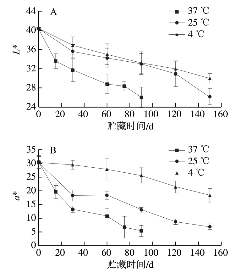 各项色泽参数中,L*值为亮度,其值越大表明色泽越明亮;a*值为红绿度,a*>0表示偏红,a*<0表示偏绿;b*值为黄蓝度,b*>0表示偏黄,b*<0表示偏蓝。由图1可以看出,草莓脯初始色泽中L*值较高,a*、b*值均为正值,总体呈现明亮的红色。食品贮藏过程中L*值下降往往表明样品存在褐变现象,但是不同食品褐变过程中3 个参数的变化规律并不相同。在蜂蜜[13]、苹果酱[14]贮藏过程中褐变表现为L*、b*值下降但a*值上升;荔枝贮藏6 d后发生褐变,表现为红色果皮的L*、a*、b*值全部下降[15]。草莓脯贮藏过程中,L*、a*、b*值均呈下降趋势,并且温度越高变化越快,变化程度最大的贮藏条件为37 ℃下贮藏90 d,L*、a*、b*值分别下降为初始值的64.46%、17.95%和21.07%。25 ℃和4 ℃下变化较慢,即便延长贮藏至150 d,L*值下降为初始值的64.81%和74.37%,a*值下降为初始值的22.79%和60.51%,b*值分别下降为初始值的37.22%和35.53%,仍高于37 ℃下贮藏90 d时的b*值。这种温度越高,变化越快的现象与蜂蜜、果汁等食品[13-15]一致。由以上数据还可以看出,3 个色泽参数对温度变化的敏感度不同,其中a*值对温度差异最为敏感,即对于贮藏时间相同的样品,不同温度间差异最大。