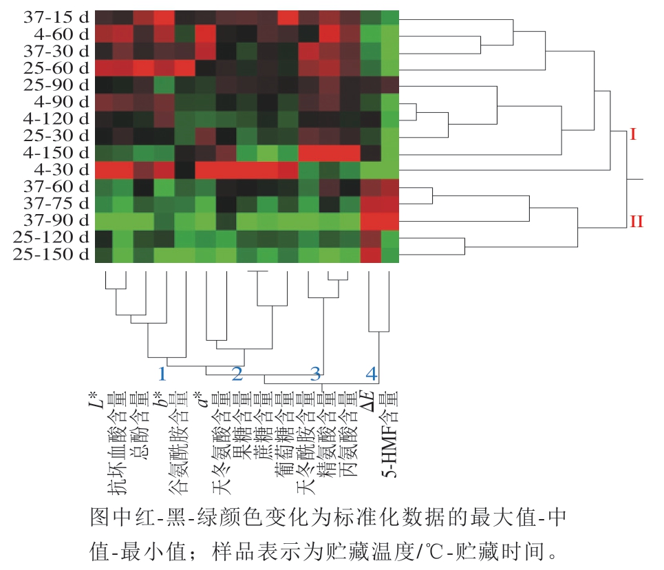 各项指标和样品双向聚类的结果如图5所示。3 个温度下不同贮藏期的15 个样品聚为两类:4 ℃下贮藏的5 个样品、25 ℃下贮藏时间较短(30~90 d)的3 个样品与37 ℃下贮藏15 d及30 d的2 个样品聚为类别I;其他5 个较高温度下贮藏时间较长的样品聚为类别II。所有指标可以分为4 组:1)L*值、抗坏血酸含量、总酚含量、b*值、谷氨酰胺含量;2)a*值、天冬氨酸含量、果糖含量、蔗糖含量、葡萄糖含量;3)天冬酰胺含量、精氨酸含量、丙氨酸含量;4)ΔE与5-HMF含量。两种类别的主要区别在于类别I中的样品第1~3组指标值较高(红/黑色为主),ΔE与5-HMF作为第4组指标红色区域仅分布于37 ℃下贮藏60~90 d的3 个样品与25 ℃下贮藏120 d及150 d的样品中,体现了5-HMF含量变化与整体色泽变化具有一定的同步性,并具有温度敏感性。5-HMF的这种变化特点说明其含量的增加可能来自于几种不同褐变途径的叠加。