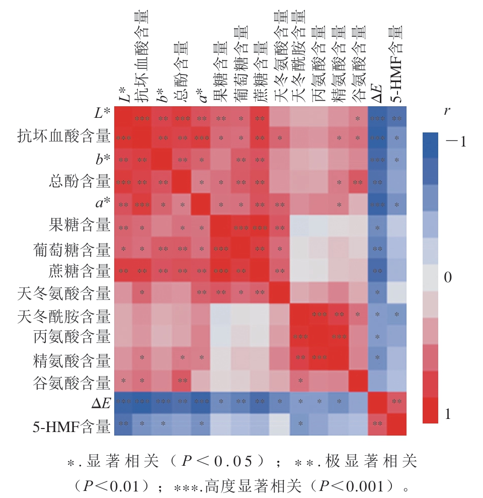 为更好地探究色泽变化与理化指标的关系,本研究对各指标进行了相关性分析。色泽、抗坏血酸、总酚、游离糖和氨基酸、5-HMF水平的相关性分析结果如图4所示,可以看出,色泽参数L*、a*、b*、ΔE之间具有明显的正相关性,说明几个参数在表征色泽变化时具有一致性,其中ΔE*与L*、a*、b*值之间的相关性均达到高度显著水平(P<0.001)。以ΔE来表征总色泽变化,发现与其高度显著相关的化学指标有抗坏血酸含量(P<0.001),其次为蔗糖、总酚、5-HMF和葡萄糖含量(P<0.01),然后为天冬氨酸、果糖、精氨酸、丙氨酸和天冬酰胺含量(P<0.05),测定的11 个化学指标中谷氨酰胺含量与其相关性不显著。但是,谷氨酰胺含量与L*值、天冬酰胺和抗坏血酸含量显著相关(P<0.05),与总酚含量极显著相关(P<0.01)。据报道,抗坏血酸的降解可分为有氧降解与无氧降解,其无氧降解主要经过水解、脱羧、脱水和成环等步骤生成二羰基化合物,可与氨基酸发生羰氨缩合等反应生成有色物质;在有氧条件下则裂解为高反应活性的小分子化合物,可与其他成分进一步反应生成褐色大分子化合物[27]。抗坏血酸含量在草莓脯贮藏过程中快速下降,与L*值、a*值、b*值、ΔE以及蔗糖和总酚含量极显著(P<0.01)或高度显著相关(P<0.001),并且和其他2 种游离糖、3 种氨基酸(天冬氨酸、谷氨酰胺、精氨酸)、5-HMF含量均表现出显著的相关性(P<0.05),说明其与褐变反应密切相关,可能发生了有氧降解、无氧降解以及与氨基酸的羰氨缩合等多途径反应。除果糖含量与b*值外,3 种游离糖含量与L*值、a*值、b*值、ΔE、抗坏血酸、总酚含量两两间均达到显著以上水平的相关(P<0.05)。但与除天冬氨酸外的其他4 种氨基酸和5-HMF含量相关性不显著(P>0.05),说明还原糖参与的美拉德反应造成的褐变与整体色泽变化存在不一致性。总体而言,根据色泽指标与各成分间的相关性,可以认为抗坏血酸、酚类物质、糖及氨基酸均参与了草莓脯褐色物质的生成,但不同反应途径具有不同步性。
