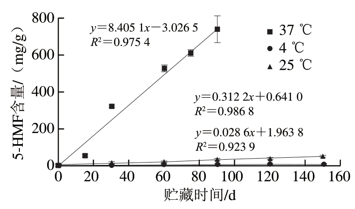 5-HMF是葡萄糖或果糖在酸性条件下脱水分解产物,是美拉德反应、焦糖化反应及抗坏血酸氧化分解反应共同的中间产物,可参与美拉德反应的晚期阶段生成褐色物质[3-5]。5-HMF往往与食品褐变程度显著相关,并作为预测褐变速率的指标[26]。如图3所示,草莓脯贮藏过程中5-HMF含量呈线性增加,且贮藏温度越高增加越快,37 ℃下增长速率分别为25 ℃和4 ℃的26.92、293.88 倍。据报道,温度对甘蔗汁美拉德褐变具有明显影响[25],不同温度下草莓脯5-HMF的生成速率存在较大差异,说明温度也是影响草莓脯褐变的重要因素。此外,由于5-HMF具有多种前体及形成途径,因此探究草莓脯贮藏过程中5-HMF形成的主要途径对于控制其褐变具有重要意义。
