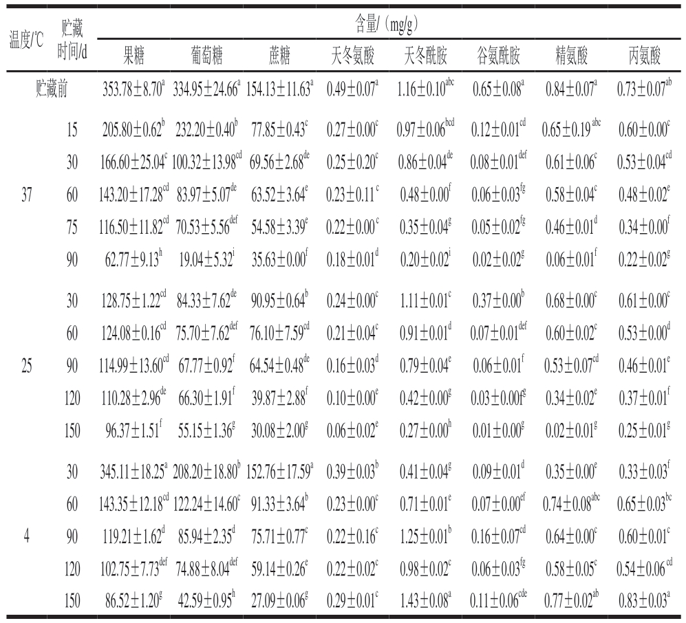 温度/℃ 贮藏时间/d含量/(mg/g)果糖 葡萄糖 蔗糖 天冬氨酸 天冬酰胺 谷氨酰胺 精氨酸 丙氨酸贮藏前 353.78±8.70a334.95±24.66a154.13±11.63a0.49±0.07a 1.16±0.10abc 0.65±0.08a 0.84±0.07a 0.73±0.07ab 37 15 205.80±0.62b232.20±0.40b77.85±0.43c 0.27±0.00c 0.97±0.06bcd 0.12±0.01cd 0.65±0.19 abc 0.60±0.00c 30 166.60±25.04c100.32±13.98cd69.56±2.68de 0.25±0.20c 0.86±0.04de 0.08±0.01def 0.61±0.06c 0.53±0.04cd 60 143.20±17.28cd83.97±5.07de63.52±3.64e 0.23±0.11 c 0.48±0.00f 0.06±0.03fg 0.58±0.04c 0.48±0.02e 75 116.50±11.82cd70.53±5.56def54.58±3.39e 0.22±0.00 c 0.35±0.04g 0.05±0.02fg 0.46±0.01d 0.34±0.00f 90 62.77±9.13h 19.04±5.32i 35.63±0.00f 0.18±0.01d 0.20±0.02i 0.02±0.02g 0.06±0.01f 0.22±0.02g 25 30 128.75±1.22cd84.33±7.62de90.95±0.64b 0.24±0.00c 1.11±0.01c 0.37±0.00b 0.68±0.00c 0.61±0.00c 60 124.08±0.16cd75.70±7.62def76.10±7.59cd 0.21±0.04c 0.91±0.01d 0.07±0.01def 0.60±0.02c 0.53±0.00d 90 114.99±13.60cd67.77±0.92f64.54±0.48de 0.16±0.03d 0.79±0.04e 0.06±0.01f 0.53±0.07cd 0.46±0.01e 120 110.28±2.96de66.30±1.91f 39.87±2.88f 0.10±0.00e 0.42±0.00g 0.03±0.00fg 0.34±0.02e 0.37±0.01f 150 96.37±1.51f 55.15±1.36g 30.08±2.00g 0.06±0.02e 0.27±0.00h 0.01±0.00g 0.02±0.01g 0.25±0.01g 4 30 345.11±18.25a208.20±18.80b152.76±17.59a0.39±0.03b 0.41±0.04g 0.09±0.01d 0.35±0.00e 0.33±0.03f 60 143.35±12.18cd122.24±14.60c91.33±3.64b 0.23±0.00c 0.71±0.01e 0.07±0.00ef 0.74±0.08abc 0.65±0.03bc 90 119.21±1.62d85.94±2.35d 75.71±0.77c 0.22±0.16c 1.25±0.01b 0.16±0.07cd 0.64±0.00c 0.60±0.01c 120 102.75±7.73def74.88±8.04def59.14±0.26e 0.22±0.02c 0.98±0.02c 0.06±0.03fg 0.58±0.05c 0.54±0.06 cd 150 86.52±1.20g 42.59±0.95h 27.09±0.06g 0.29±0.01c 1.43±0.08a 0.11±0.06cde 0.77±0.02ab 0.83±0.03a